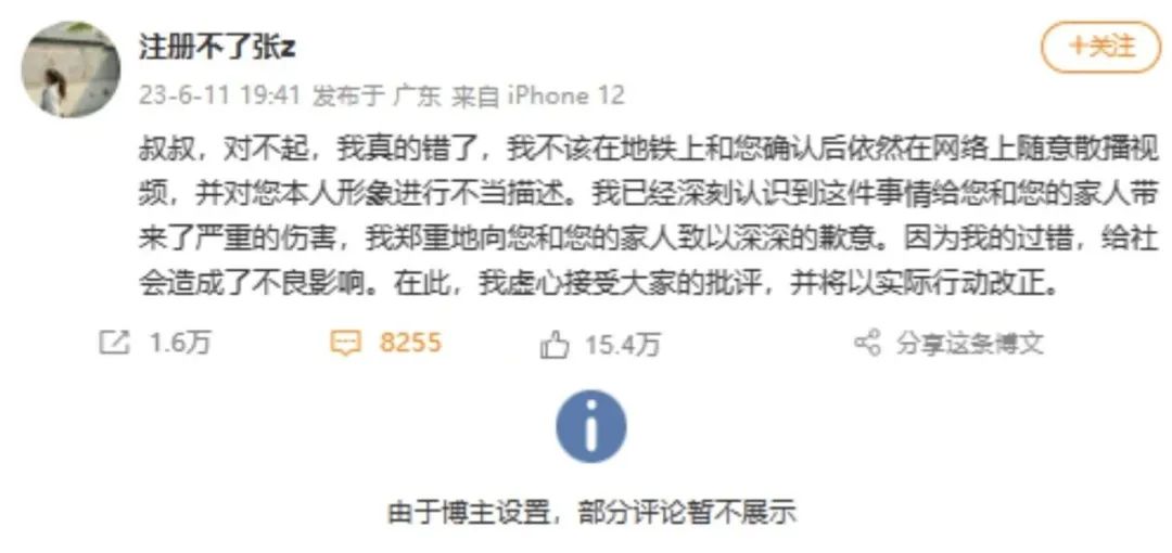 6月7日11時39分,微博用戶“@注冊不了張z”發(fā)文稱其在乘坐廣州地鐵8號線時,懷疑遭到一位大叔偷拍,便要求大叔展示相冊“自證清白”,經(jīng)檢查發(fā)現(xiàn)相冊里沒有偷拍內(nèi)容后警告大叔“小心點啊,別亂拍”。這一舉動引發(fā)爭議,部分網(wǎng)民支持女生的維權(quán)行為,但也有網(wǎng)民認(rèn)為這是“造謠生事”,發(fā)視頻曝光的行為構(gòu)成侵權(quán)。該博主還在文中稱大叔手法熟練,“不像第一次作案”,并回復(fù)那些指責(zé)其惡意誣陷的網(wǎng)民稱“既然沒有偷拍,那他為什么不為自己發(fā)聲”,相關(guān)言論引發(fā)網(wǎng)民不滿,有網(wǎng)民扒出該賬號所有人為河南大學(xué)學(xué)生張某,目前已保送為四川大學(xué)新聞傳播專業(yè)碩士研究生,其在快手、小紅書、抖音等多個平臺均有賬號運(yùn)營。不少網(wǎng)民就當(dāng)事人身份和所學(xué)專業(yè)開始挖苦諷刺。6月9日,廣州地鐵通過媒體回應(yīng)稱,事發(fā)當(dāng)時已有警方介入處理,由于是誤會,雙方已經(jīng)和解。四川大學(xué)也表示此事已經(jīng)在調(diào)查。