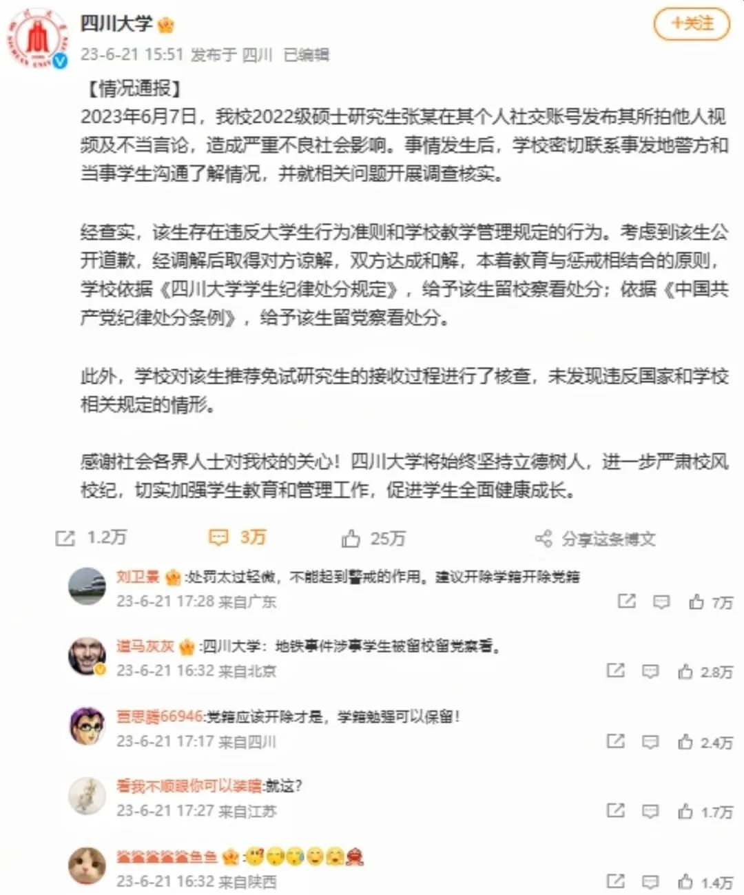 歷經(jīng)較長的沉淀期后,6月21日,四川大學(xué)官微發(fā)布通報稱,最終給予張某留校和留黨察看處分。經(jīng)對張某保研過程進(jìn)行核查,未發(fā)現(xiàn)其違反國家和學(xué)校相關(guān)規(guī)定。多數(shù)網(wǎng)民不認(rèn)可此結(jié)果,認(rèn)為四川大學(xué)放任學(xué)生不當(dāng)行為,處置不公。有網(wǎng)民反問稱“明顯的造謠,為何僅以道歉結(jié)束”;還有網(wǎng)民認(rèn)為高校的教育機(jī)制和培養(yǎng)標(biāo)準(zhǔn)出現(xiàn)問題,質(zhì)疑如此品行的大學(xué)生將來進(jìn)入媒體,職業(yè)素養(yǎng)堪憂。大V“@老徐時評”指出:“造謠也好,拒不道歉也好,這些都屬于個人品德問題,并不是重點。這個事件的重點,是后續(xù)被發(fā)現(xiàn)的保研等問題,關(guān)系到教育公平,關(guān)系到普通百姓的上升渠道和上升空間?!?月25日,北京一家律師事務(wù)所發(fā)布通報,認(rèn)為四川大學(xué)的畢業(yè)生品質(zhì)難以信服,故該所不再招聘該校畢業(yè)生。部分網(wǎng)民對此叫好,部分人則認(rèn)為此舉涉嫌炒作和就業(yè)歧視。“@人民日報”評論呼吁,莫因個體案例為群體“貼標(biāo)簽”。