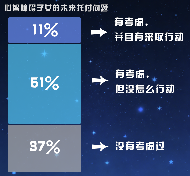根據(jù)《心智障礙者家庭需求與未來托付調(diào)研報告》顯示,僅11%的家庭考慮過心智障礙子女的未來托付問題,并采取了行動;51%的家庭只是考慮過相關(guān)問題,但是沒有采取行動;而37%的家庭壓根沒有考慮過相關(guān)問題。