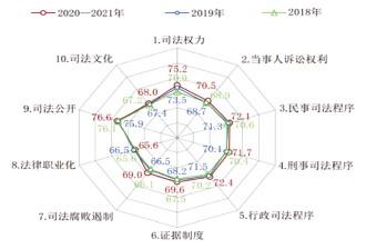 2.2020-2021年值得注意的數(shù)據(jù):一是上海市以73.3分排在中國(guó)司法文明指數(shù)得分第一名,這是其在七年評(píng)估中第五次排名第一,比2019年第一名浙江的72.5分高出0.8分;內(nèi)蒙古自治區(qū)以69.2分在各省/自治區(qū)/直轄市中排名墊底,但比2019年最低分湖南67.1分提高了2.1分;二是31個(gè)省/自治區(qū)/直轄市最高分與最低分的分差為4.1分,相較于2019年最大分差5.4分,縮小了1.3分,這說(shuō)明全國(guó)各地司法文明的差距進(jìn)一步縮??;三是31個(gè)省/自治區(qū)/直轄市的得分均未達(dá)到“良好”水平,說(shuō)明各地司法文明建設(shè)還有很大的努力空間。
