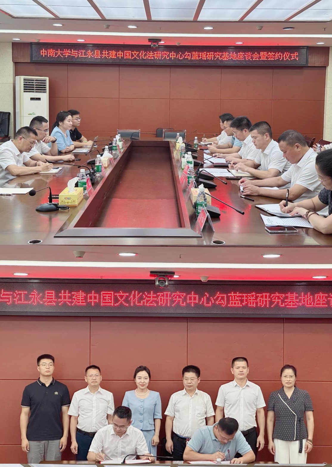 7月28日,“中南大學(xué)中國文化法研究中心勾藍(lán)瑤研究基地”在湖南省永州市江永縣蘭溪瑤族鄉(xiāng)勾藍(lán)瑤寨揭牌并簽署共建勾藍(lán)瑤研究基地合作協(xié)議,中共江永縣委書記唐德榮,縣委常委、宣傳部長高厚德,副縣長蔣劍平,中南大學(xué)法學(xué)院院長許中緣,中國文化法研究中心執(zhí)行主任易玲、法學(xué)院教授唐東楚、講師郭壬癸以及縣委各部門負(fù)責(zé)人出席座談會及簽約儀式。