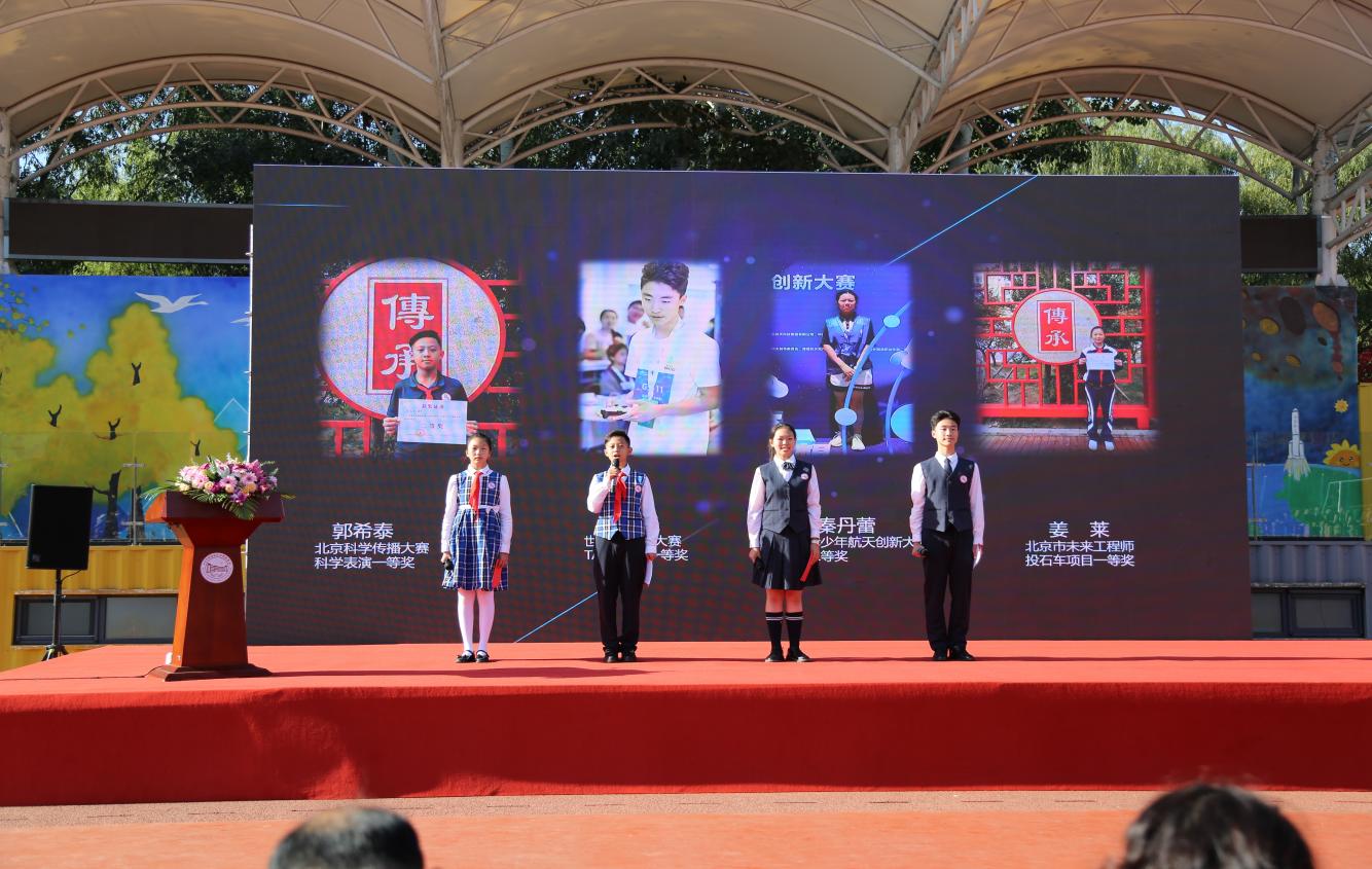 活動現(xiàn)場,分別獲得2021年第三屆北京科學傳播大賽中榮獲科學表演團體一等獎、2023年北京市未來工程師競賽小學組一等獎、2022年世界機器人大賽總決賽挑戰(zhàn)賽一等獎、2023全國青少年航天創(chuàng)新大賽二等獎的四名學生代表郭希泰、劉嘉樂、秦丹蕾、姜萊,分享了參加科技活動的經(jīng)歷與心得體會。“每周兩節(jié)的科學課點燃了我們的太空夢”“在一次次賽前集訓中,通過老師帶領我們查找資料、研究原理、設計作品等動手實踐活動,我提高了綜合運用知識的能力和創(chuàng)造性解決問題的能力”“曾經(jīng)基礎科學知識薄弱的我,各種提問占用老師很多時間,老師卻總是表揚我虛心求教的態(tài)度”“在討論比賽項目時,我們在相互提問中碰撞思維的火花,我學會了如何傾聽、如何溝通”……學生們認為,他們科學興趣的激發(fā)、科學探究能力的提升、科技實踐能力的強化、科技探索之路的開啟,離不開學校豐富的科技教育課程、科技競賽平臺的搭建、老師的悉心教導與鼓勵、小組的合作探究。
