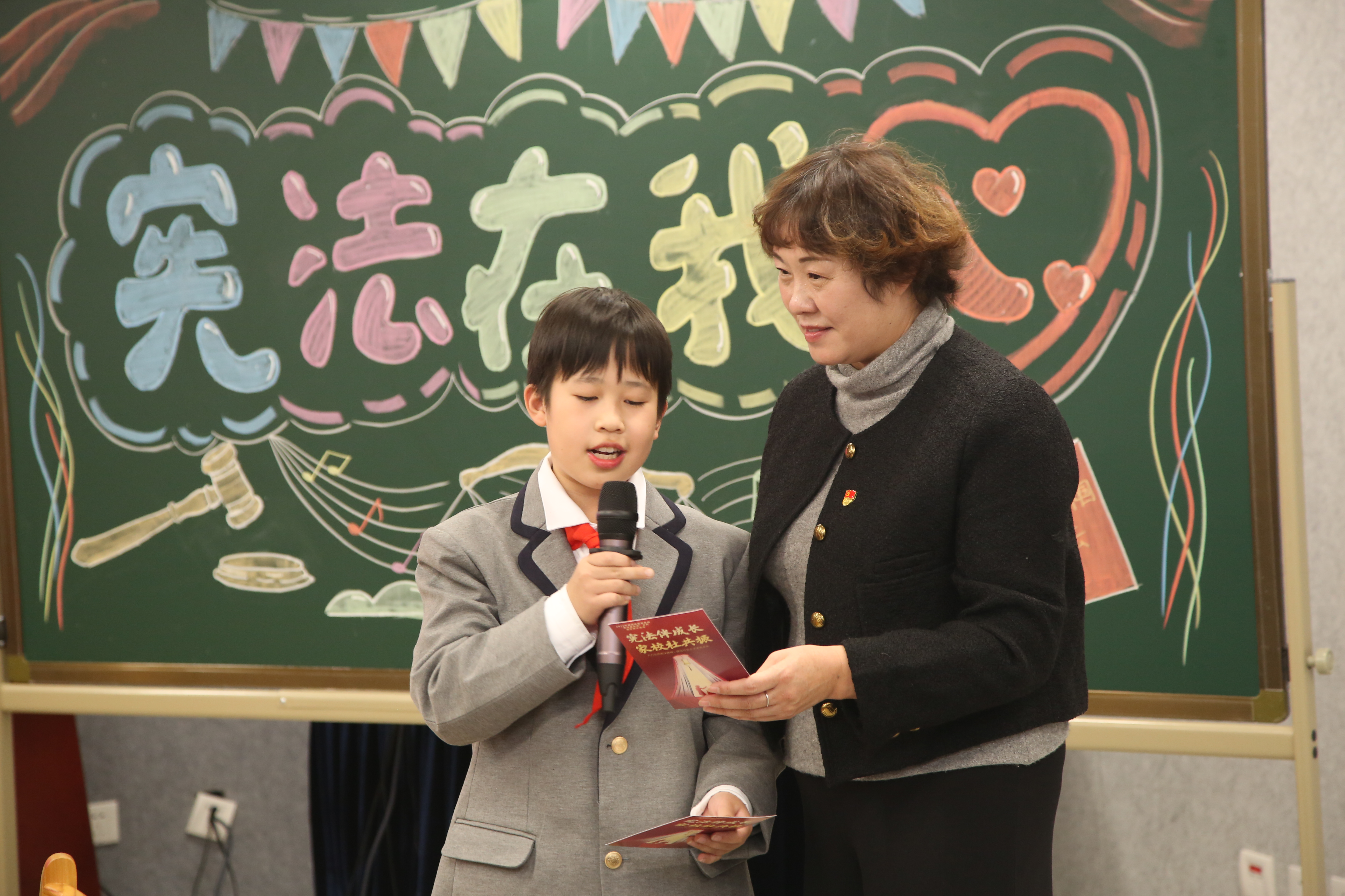 “憲法伴成長 家校社共振”主題活動現(xiàn)場,北京市朝陽區(qū)高家園小學果春平書記與學生分享憲法名片。