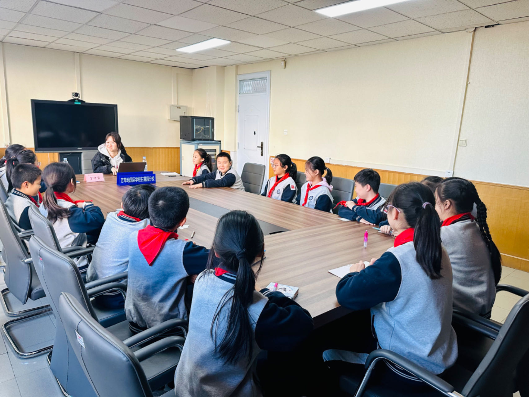 北京大學法學院丁葉萱與北京市朝陽區(qū)芳草地國際學校甘露園分校小學部甘露校區(qū)學生進行法律知識座談會。