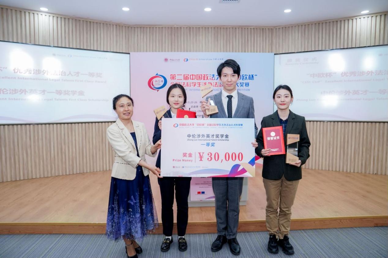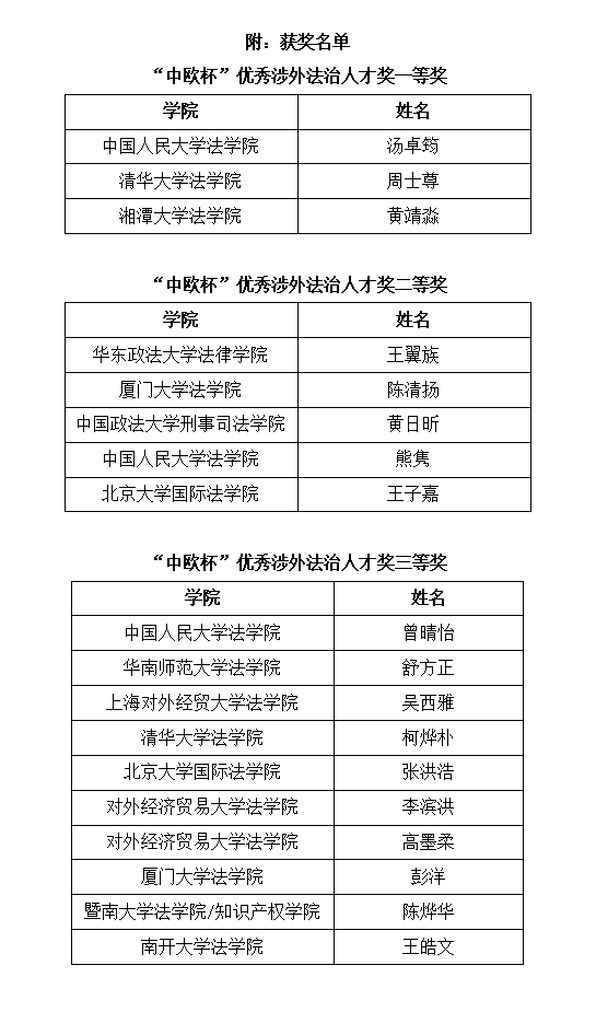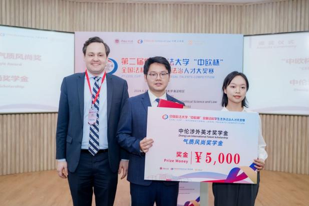 經(jīng)過激烈角逐,最終,中國人民大學(xué)湯卓筠、清華大學(xué)周士尊、湘潭大學(xué)黃靖淼3名選手榮獲“中歐杯”優(yōu)秀涉外法治人才一等獎。另有22名選手分別獲“中歐杯”優(yōu)秀涉外法治人才二等獎、三等獎、“涉外法治人才氣質(zhì)風(fēng)尚獎”“涉外法治人才團隊合作獎”等。在5月26日下午舉行的閉幕式暨頒獎儀式上,中國政法大學(xué)黨委副書記王立艷、中倫律師事務(wù)所高級顧問王霽虹等為選手頒獎。獲獎同學(xué)同時獲得“中倫涉外英才獎學(xué)金”。