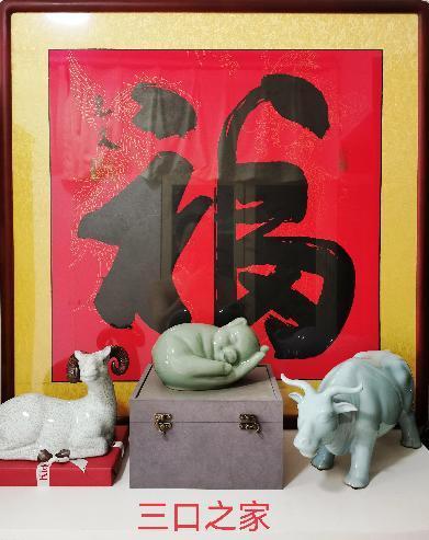 毫無疑問,正是這件作品隱含的濃烈親情元素和快樂因子,深深吸引并打動了我,才最終成全了這筆交易,甚至讓我一不做二不休,干脆還買下了自己和夫人的生肖作品——羊和牛。返京后,我們將這三件清一色吃素的屬相工藝品,和家中原有的一幅大紅“?!弊謹[在一起,便組合出一幅別有情趣的“和諧家園風景圖”:幸福一家人、快樂一家親。