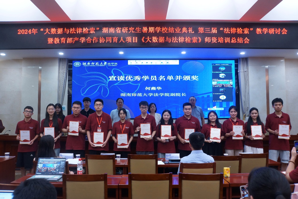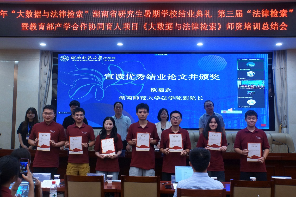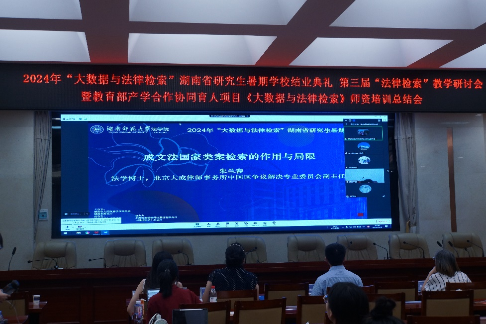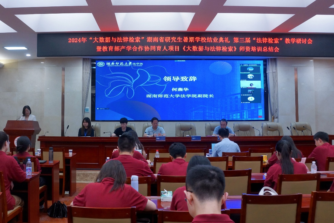 7月28日上午,2024“大數(shù)據(jù)與法律檢索”湖南省研究生暑期學(xué)校結(jié)業(yè)典禮、第三屆“法律檢索”教學(xué)研討會(huì)暨教育部產(chǎn)學(xué)合作協(xié)同育人項(xiàng)目《大數(shù)據(jù)與法律檢索》師資培訓(xùn)總結(jié)會(huì)在湖南師范大學(xué)法學(xué)院舉行,湖南師范大學(xué)法學(xué)院副院長(zhǎng)何燕華、湖南師范大學(xué)法學(xué)院副院長(zhǎng)歐福永、湖南師范大學(xué)法學(xué)院副教授黃文旭、本次暑期學(xué)校班主任李部(北大法寶學(xué)堂)、湖南師范大學(xué)法學(xué)院法碩辦輔導(dǎo)員羅昊、大連財(cái)經(jīng)學(xué)院教師王杰彥、武漢東湖學(xué)院教師王建東、大連海事大學(xué)法學(xué)院教師吳淞豫及線上嘉賓廣東外語外貿(mào)大學(xué)教授曾赟、北大法寶副總經(jīng)理何遠(yuǎn)瓊博士出席本次結(jié)業(yè)典禮。湖南師范大學(xué)法學(xué)院研究生工作辦公室主任王丹主持本次結(jié)業(yè)典禮。